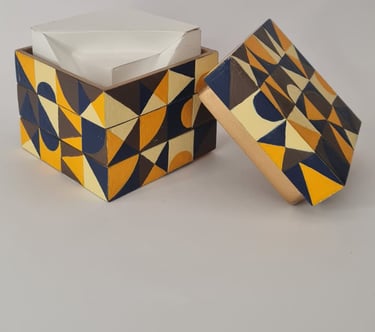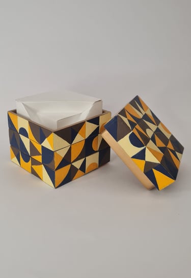 Este projeto é um cubo de MDF de 80mm. A ideia é criar uma peça interativa que revela diferentes composições visuais. Com o uso de corte a laser e uma paleta de cores bem definida, o projeto une precisão digital e técnica artesanal para transformar um objeto simples em algo lúdico e funcional.